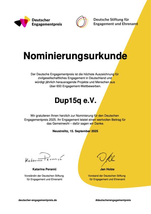 Unser Engagement für Dup15q-Betroffene wird damit bundesweit sichtbar.
